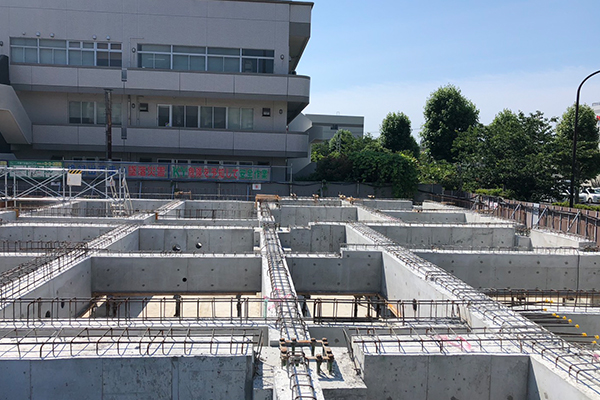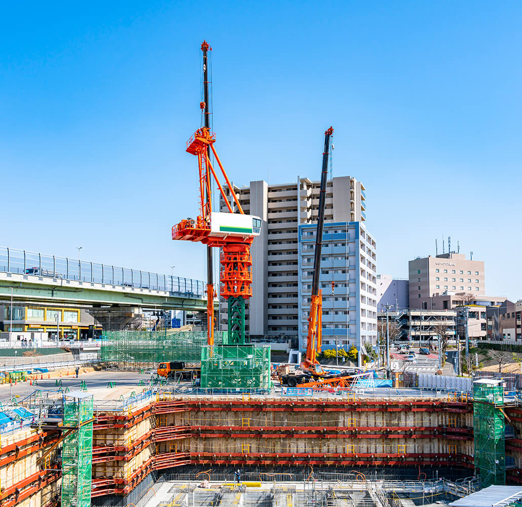 当社では、建築基礎工事も承っています。集合住宅、大手企業店舗等の建物を支持し、安定させるための土台作りは、建築物が完成すると隠れる部分になるため、管理・監督が何よりも大切になります。イーストの建築基礎工事は、大手住宅メーカ等からその高い信頼で高評価を頂いています。